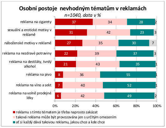 “Mezi citlivá témata patří postoje k reklamě na cigarety, alkohol, nezdravé potraviny a volně prodejné léky, které sledujeme již řadu let. Vzhledem k aktuální diskuzi ve společnosti jsme v roce 2015 rozšířili tento „seznam“ o názory na náboženská témata v reklamě. Ta se zařadila mezi ty častěji odmítané. Naprosto zakázat by si lidé nejčastěji přáli reklamu na cigarety. S tím souhlasí 37 % populace, naprostou volnost by ponechalo 28 % Čechů.“