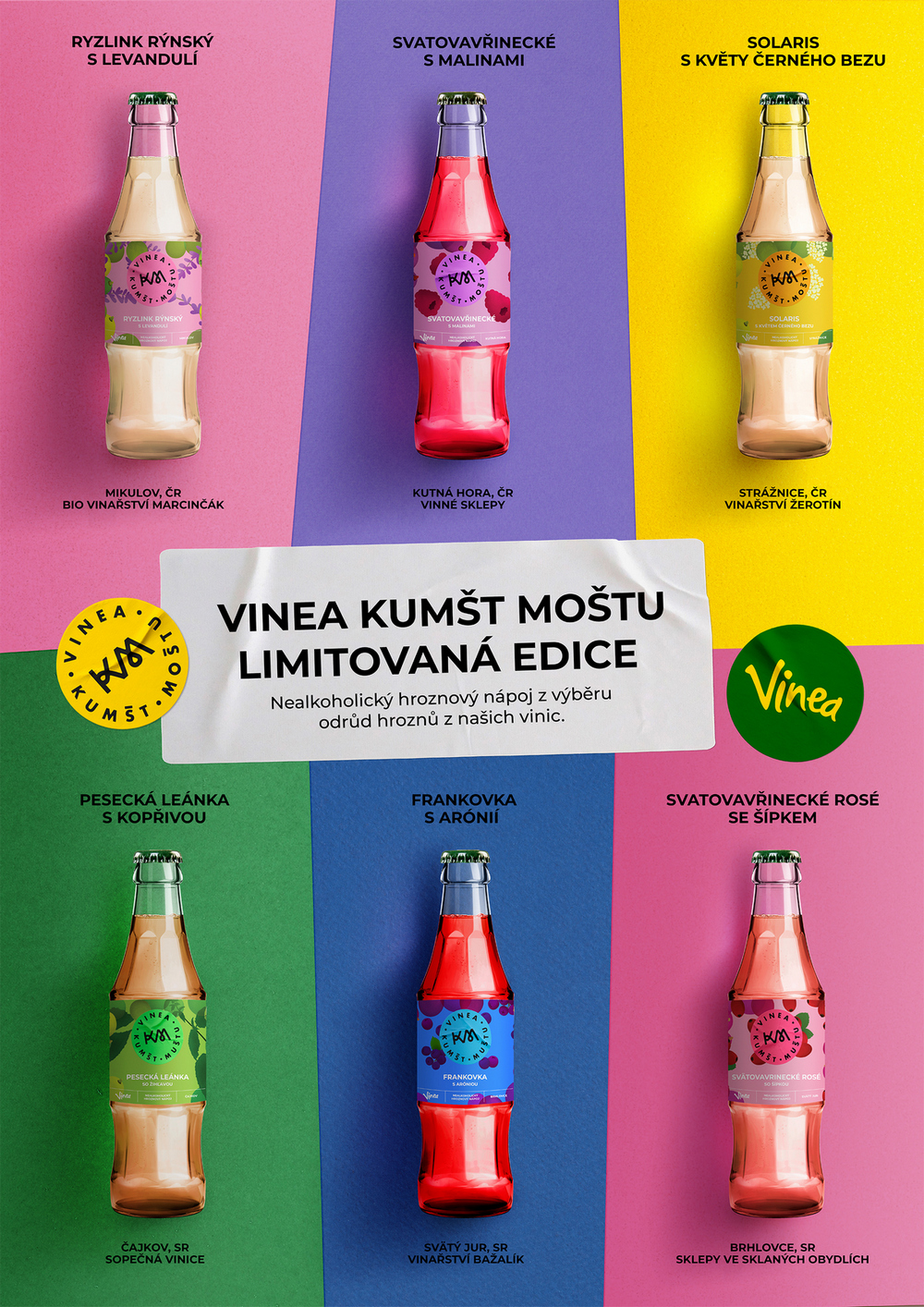 Limitovaná edice degustační sady Vinea Kumšt moštu je přírodní nápoj s obsahem 30 % hroznového moštu, zcela bez přidaného cukru. Tři odrůdy hroznového moštu jsou spojené s extraktem z bylinek, další tři s ovocnou šťávou. Sada obsahuje bílé i červené odrůdy a jedno rosé a vedle pěti variant perlivých nápojů najdete i jednu neperlivou variantu.
