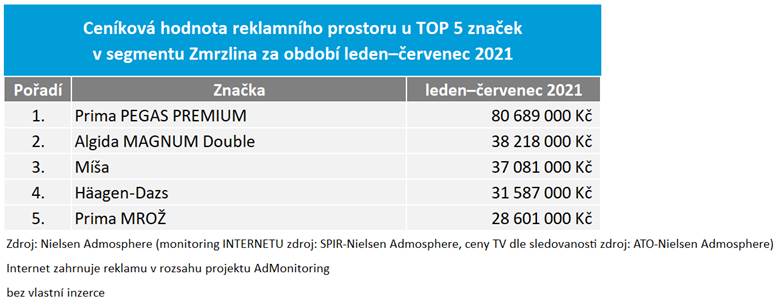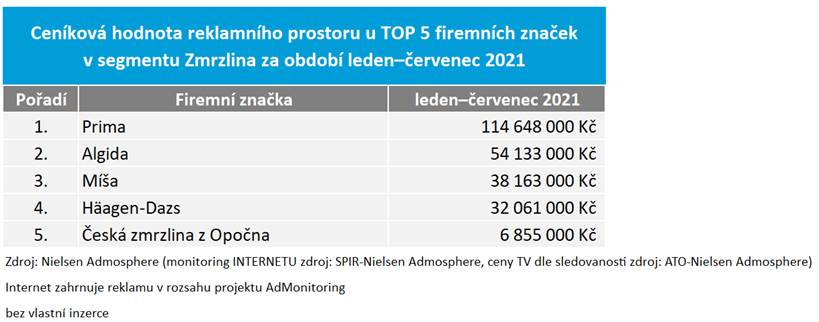 Výzkumná agentura Nielsen Admosphere sestavila v rámci svého měsíčního seriálu krátkých zpráv z monitoringu reklamy Ad Intel přehled nejsilnějších inzerentů z řad firemních a produktových značek v segmentu zmrzlin v období leden–červenec 2021. Hodnoty odpovídají ceníkovým cenám.