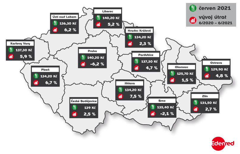 „Tříprocentní meziroční růst odráží vývoj inflace v České republice. Očekáváme, že ceny obědů i výše útrat i nadále porostou. Restaurace totiž čelí rostoucím nákladům. Zdražují jim ceny surovin, budou muset finančně motivovat zaměstnance k návratu do sektoru pohostinství a v neposlední řadě stále nepracují na plný výkon. Češi totiž zatím chodí na jídlo mnohem méně často, než jak byli zvyklí,” říká generální ředitel Edenredu Nicolas Eich. Počet obědových transakcí tak byl v červnu, kdy již byly otevřeny jak zahrádky, tak interiéry restaurací, oproti době před pandemií o 57 procent nižší. Výrazně propad nastal i v porovnání s loňským letním rozvolněním. V červnu 2020 – za stejných podmínek jako letos – byly obědové tržby restaurací v propadu pouze o 22 procent proti předcovidovému období.